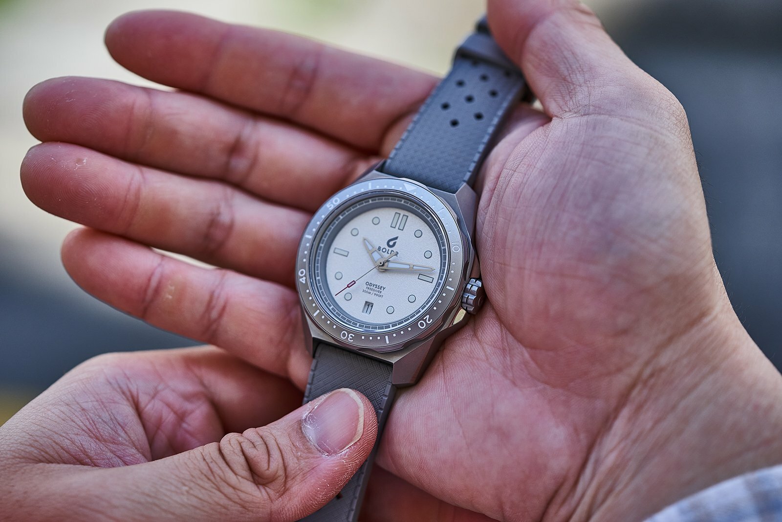 自豪佩戴——Freediver 40 毫米纖巧錶殼是BOLDR 堅固耐用的潛水員系列的新成員,適合不同大小的手腕,並配有清晰標有夜光指針和時標的超級易讀錶盤。