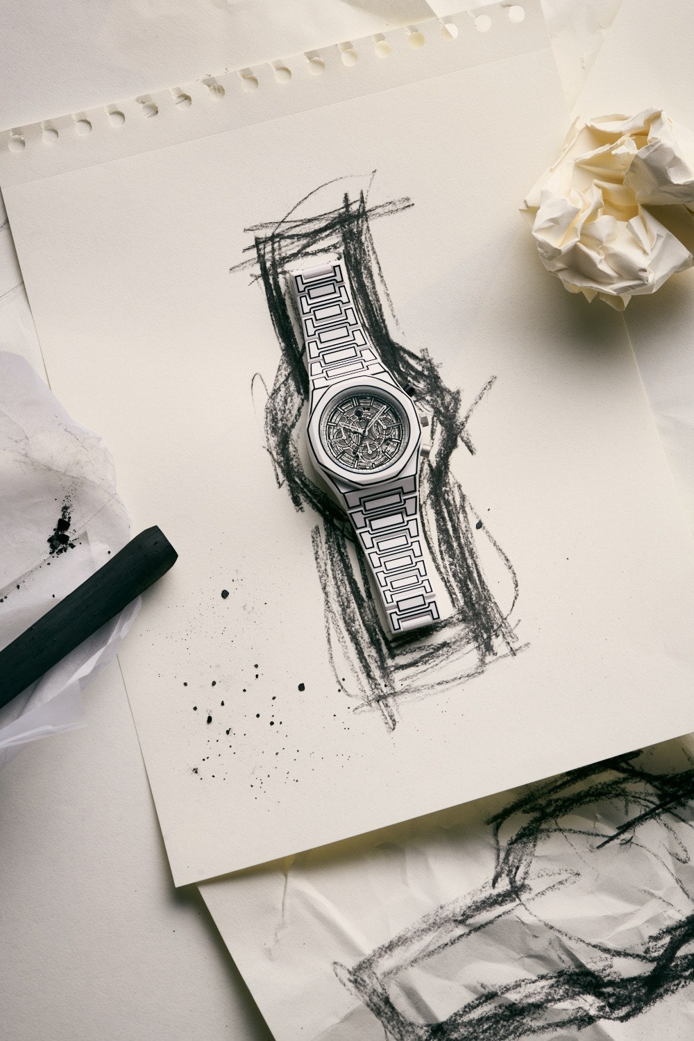 D1 Milano Skeleton Sketch 是一款大膽的鏤空腕錶,採用白色 Cerakote® 錶殼和錶帶。黑色素描風格的線條在設計中營造出手繪效果。配備鏤空錶盤和透明錶背,將藝術氣息與精準製錶工藝完美融合。